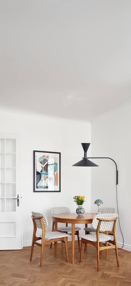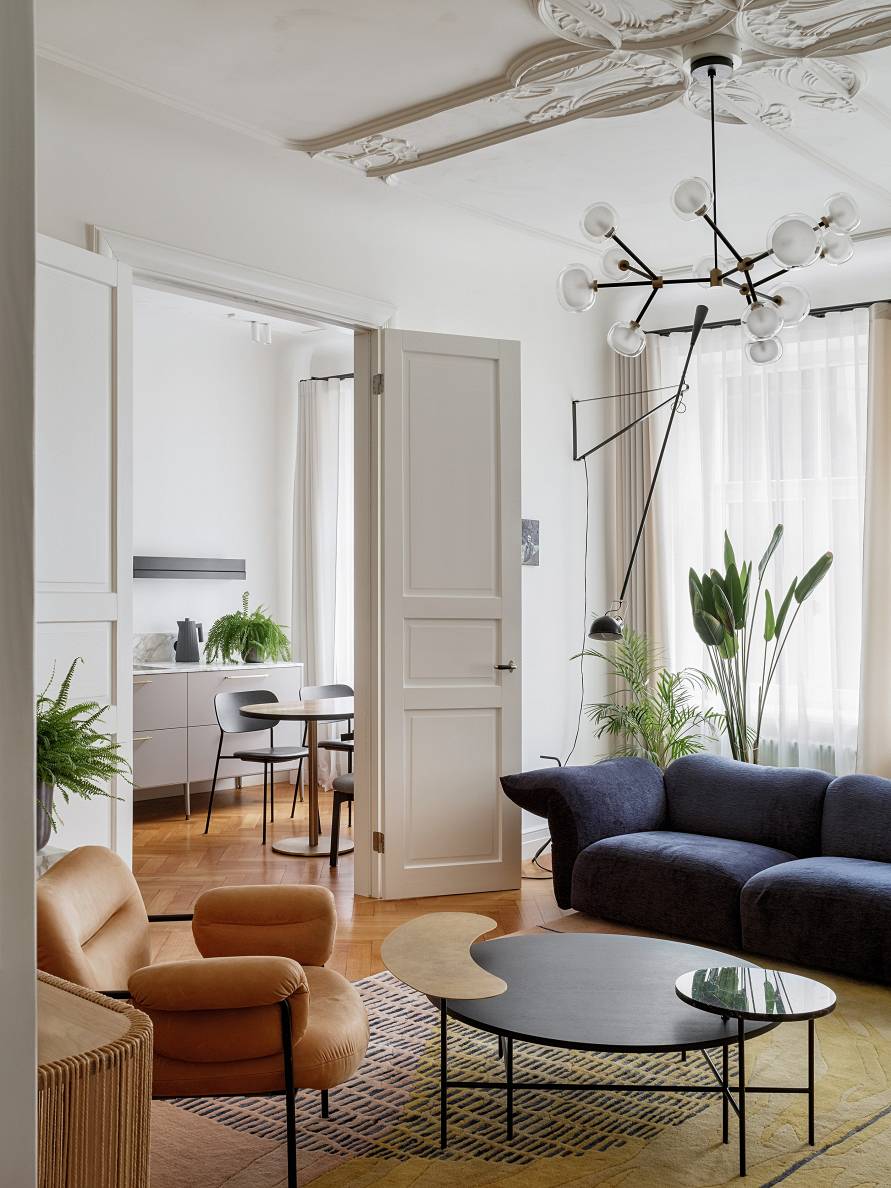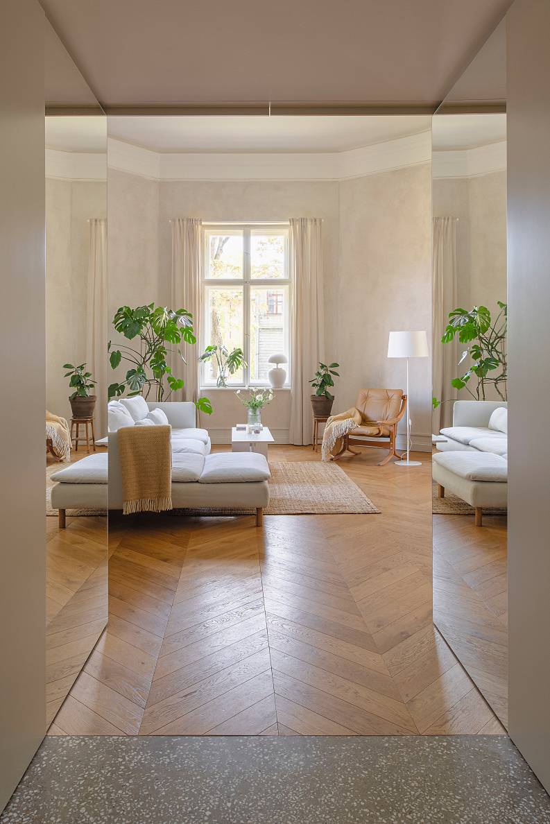 Silti baltais tonis lielās plaknēs noteikti ir viena no veiksmīgākajām izvēlēm, lai akcentētu seno Rīgas namu cēlumu. Interjera autore –