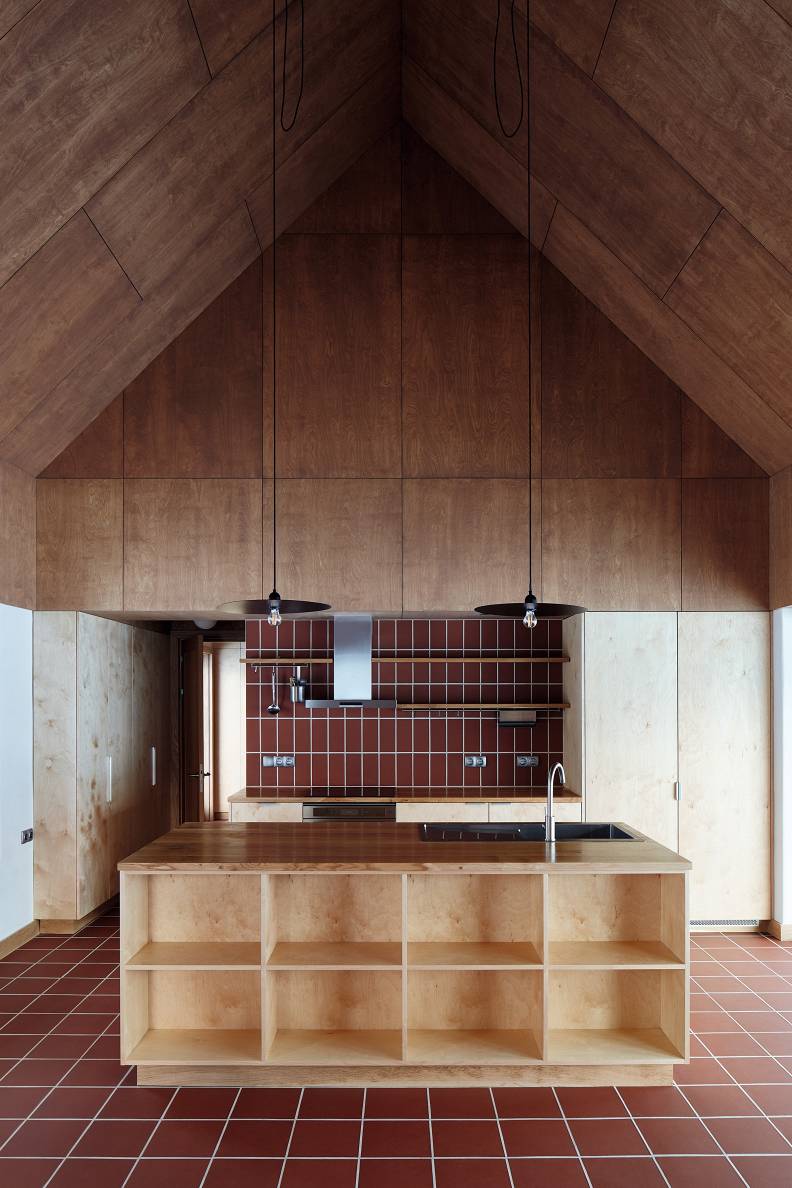 Šīs ēkas interjers demonstrē, kā drosmīgi kombinēt dažādu toņu saplāksni. Pie griestiem tas izraudzīts tumšāks, kas vizuāli tos nedaudz piezemē. Interjera
