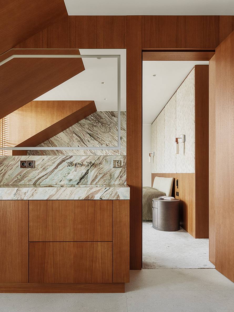 Koka apdare caurvij ēku abos stāvos, un tā siltais, medainais tonis turpinās no virsmas uz virsmu. Interjera autore – Agnese Rudzīte.