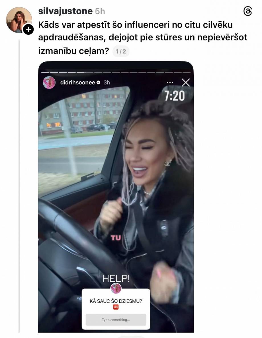 Pēc kāda Threads lietotāja ieraksta par influenceri Elīnu Didrihsoni, kurā tiek izteikts satraukums par viņas uzvedību pie auto stūres, sociālajos tīklos uzvirmojusi diskusija par atbildīgu uzvedību ceļu satiksmē. Ierakstā izskan aicinājums «atpestīt šo influenceri no citu cilvēku apdraudēšanas», atsaucoties uz video, kurā Didrihsone, vadot automašīnu, lūdz sekotājiem palīdzēt atminēt dziesmas nosaukumu un vienlaikus dejo pie stūres.