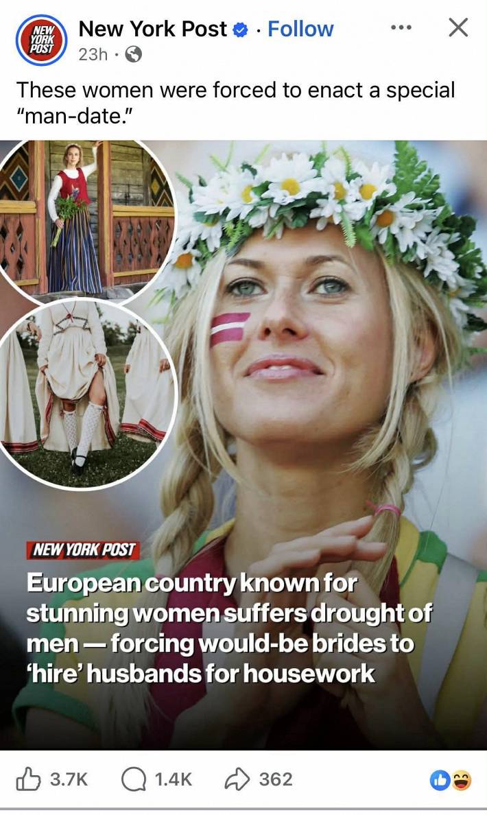Raksta autors atsaucās uz Eiropas Komisijas pētījumu, ka Latvijā sieviešu esot par 15,5 procentiem vairāk nekā vīriešu. Šis procentu rādījums ir trīsreiz lielāks nekā vidēji Eiropas Savienībā. Savukārt vecumā virs 65 gadiem sieviešu esot pat uz pusi vairāk nekā stiprā dzimuma pārstāvju. Rakstā ar pieredzi dalījusies kāda vientuļa sieviete, kura atklājusi – mājas darbos ar santehniku, elektroniku un remontiem nolīgst «vīriešus ar zelta rokām». Par attiecīgu samaksu viss tiekot paveikts bez neveikliem randiņiem. Raksts izraisījis gandrīz 300 lasītāju komentārus. Slaveni tiktokeri, kuriem ir miljoniem sekotāju, izmantojot Janas bildi, izveidojuši interneta mēmes, kurās apspēlējuši, kā amerikāņi jau traucas palīdzēt latvju dāmām.