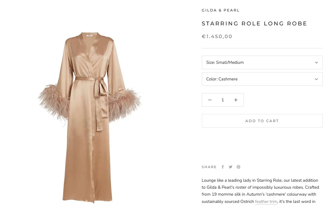 Šāda veida halātiņš atrodams latviešu zīmola Amoralle 2020. gada kolekcijā. Jutekliskā rītakleita, kādu Amoralle klientes gan mēdz valkāt arī ārpus guļamistabas, latviešu zīmola internetveikalā dažādās krāsās nopērkama par 825 eiro.