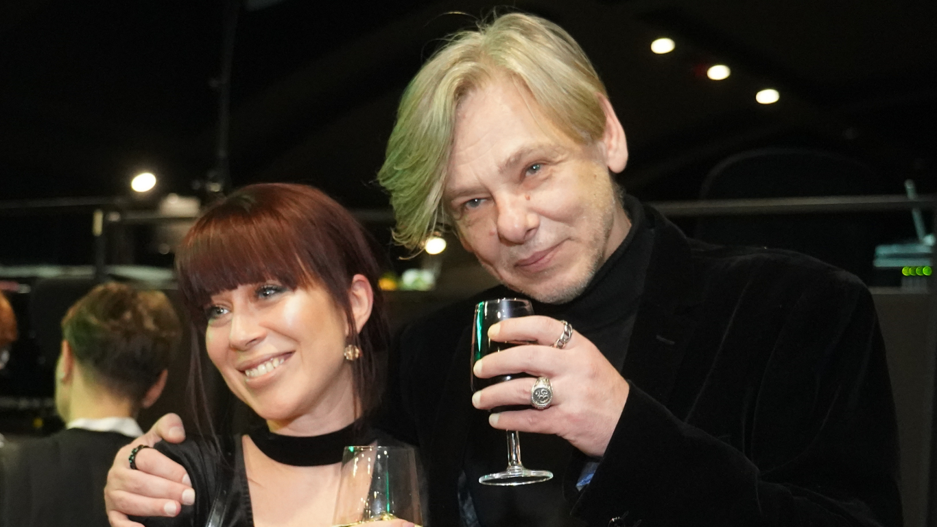 Režisors Dž. Dž. Džilindžers un kustību konsultante Linda Kalniņa pēc lugas _Zvaigznāji_ pirmizrādes Mihaila Čehova Rīgas Krievu teātrī fotogrāfiem pozēja, mīļi apskāvušies.