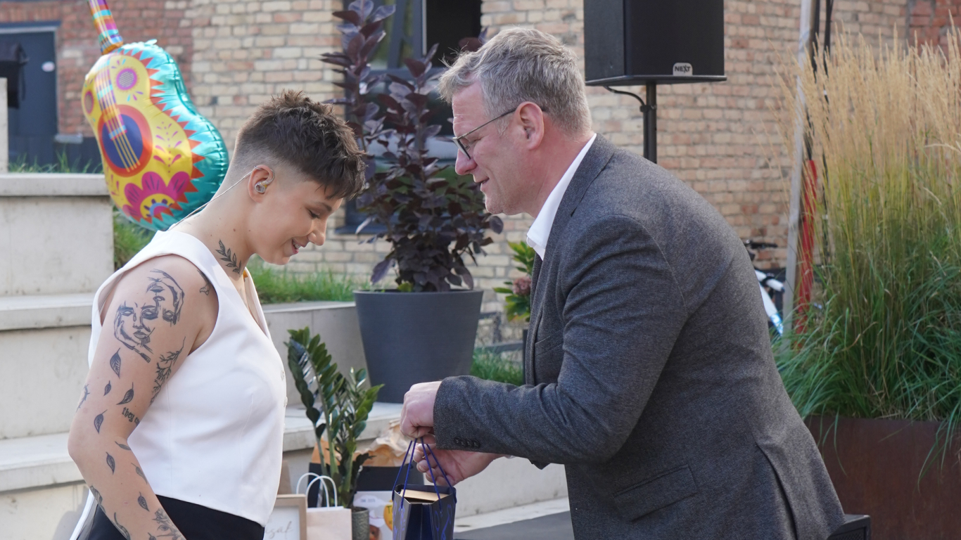 Viņš bija sarūpējis gaviļniecei noderīgu dāvaniņu. «Ir rudens, gan jau medus pie tējas noderēs! Arī krūzīte, no kuras to dzert,» viņš atklāja dāvanu maisiņa saturu. Kleinbergs pastāstīja, ka ar Emiliju iepazinies ar Rīgas domes Jauniešu atbalsta centra starpniecību. «Man patīk viņas dziesmas, tās ir ritmiskas un drusku smeldzīgas,» saka Rīgas mērs.