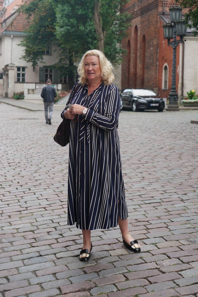 «Vasarīga, pietiekami lakoniska kleita darba uzsākšanai. Lai gan auduma raksts ir tumši zils ar smilškrāsas svītrām, tas ir sarežģīts un rāda, ka deputāte uz darbu ierodas ar domām – būs dažādi periodi. No tumšā uz gaišo un atpakaļ. Tas ir ķīniešu melnā un baltā nepārtrauktības princips, kuru deputāte, starp citu, rāda arī savos apavos. Vertikālās līnijas nozīmē, ka vienā situācijā deputāte visā savā nostājā būs tumšāka, bet jau nākamajā – gaišāka, proti, tiks sperti gan negatīvi, gan arī pozitīvi soļi. Ja līnijas būtu horizontālas, pastāvētu kompromisu iespēja.»