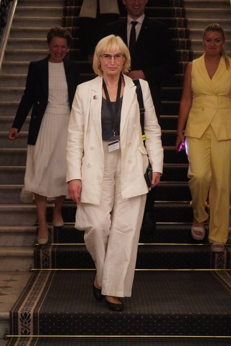 «Baltais lins izvēlēts viltīgi. Tas norāda – esmu maksimāli tīra, bet burzīgais lins iedod īpašu maskēšanās auru. Burzīgus apģērbus politiķi izvēlas, lai savu vēlētāju acīs izskatītos demokrātiskāki. Visur pasaulē vērojams, ka kreisā spārna deputāti ir krietni saburzītāki nekā labā spārna pārstāvji. Tērps valkātājai piestāv, bet absolūti neliecina, ka viņa ieradusies uz rudens sesiju. Daudz labāk tas derētu jūnijā, īsi pirms došanās atvaļinājumā. Varbūt pavasara sesijā darbā palika kas nepabeigts, un tuvākajā laikā deputāte šai problēmai pieliks punktu.»