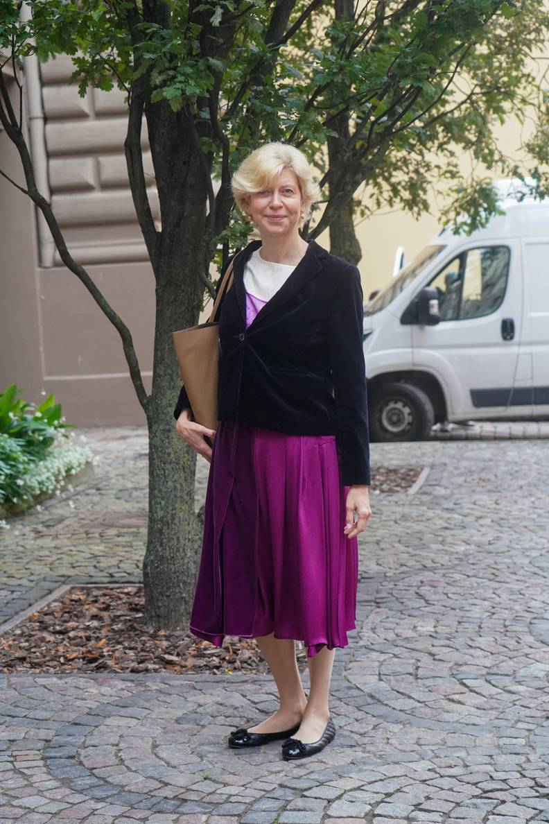 «Kostīms piestāv, tas izceļ sievišķīgo figūru. Dekoltē zona liecina par uzdrīkstēšanos un apņēmību. Te nav nekā lieka, vienīgais mazliet mulsina spilgti dzeltenā krāsa. Tā var būt aizņemta no Ķīnas, kur dzeltenā ir pūķu krāsa. Šis tēls liecina, ka deputāte būs spilgta, neatkarīga, sievišķīgi emocionāla un kā pūķis ies pretī vīriešu gribai un varai. Laiviņkurpes no valkāšanas etiķetes viedokļa tomēr vajadzētu nesāt kaut ar plānām, bet zeķbiksēm.»