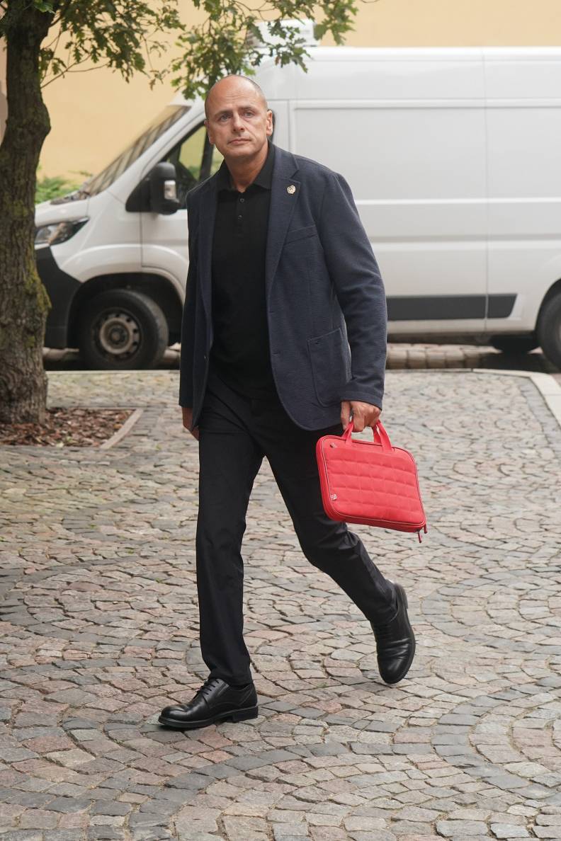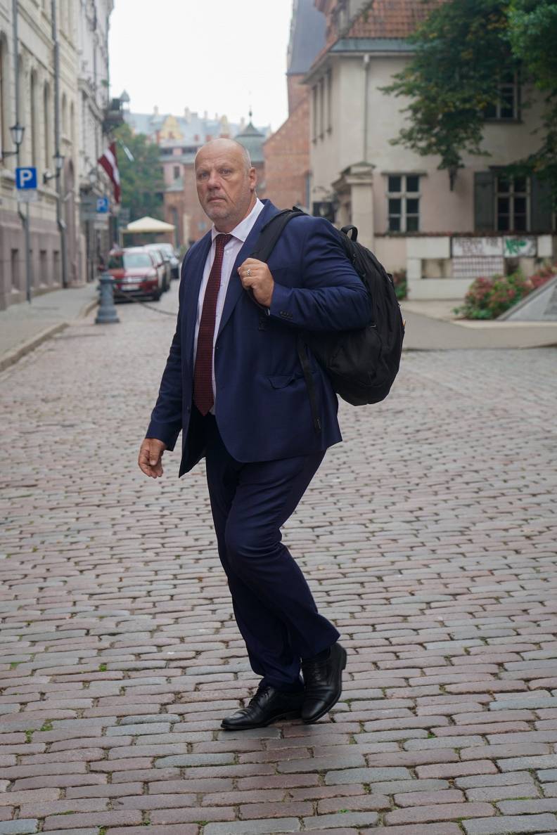 «Šis ir vīriešu ģērbšanās jaunāko tendenču paraugs – žakete no blīva trikotāžas auduma, polo krekls, klasiskas bikses un biroja-ielas apavi. Šādi izskatās tipisks IT jomas galvenais menedžeris, kurš ļauj procesiem noritēt sev vēlamā virzienā. Politikā šādi ģērbjas tā dēvētie pelēkie kardināli. Sarkanā datorsoma, kas galīgi nav no šī apģērba komplekta, liek nojaust, ka politiķis var aizmirst kādas ļoti būtiskas lietas. Viss liecina, ka deputāts uz darbu šoreiz dodas kā novērotājs, kuram ir ļoti ierobežots laiks.»