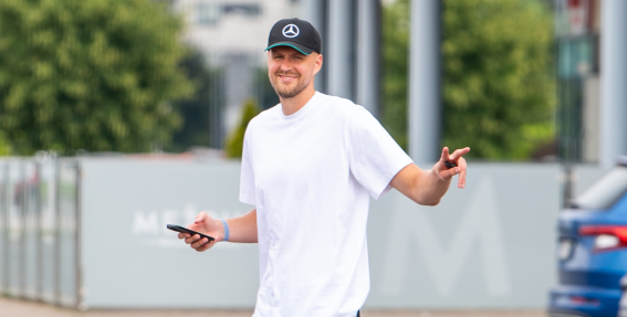 No saules stariem viņš slēpjas zem F1 komandas Mercedes AMG Petronas oficiālās 2024. gada komandas cepurītes. Tās cena ir ap 310 eiro.