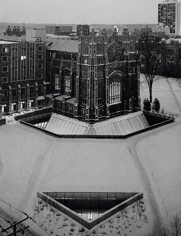 Birkerts izveidoja iespaidīgu pazemes pasauli, trīs stāvu struktūru. Balsti apdarīti ar spoguļstiklu, kas, viens otrā atstarojoties, pazemē ieplūdina rāmu dienasgaismu. Virszemes pasakainā gotika atspoguļojas arī pazemē. Dzejiski – jo dziļāk nokāp, jo stiprāk šķiet, ka esi tuvāk debesīm. Birkerta risinājums panācis ilūziju, ka neatrodies pazemē, – viņš gaismu bibliotēkas pazemes daļā ievada no divām pretējām pusēm.