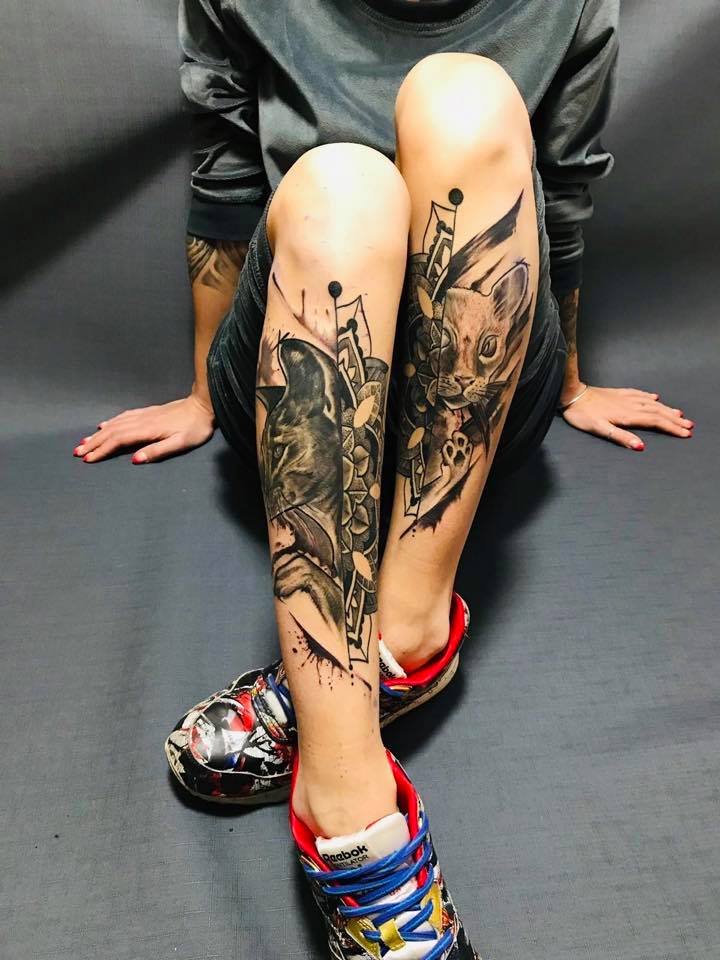 «Tetovējumu autors ir jauns un talantīgs puisis Arnis Kaķis. Viņš abu kaķu tetovējumus ir arī uzzīmējis. Gandrīz visi mani tetovējumi ir meistaru mākslas darbi. Es tikai aptuveni izstāstu ideju, ko vēlos.» Uz jautājumu, kāpēc kaķu tetovējumiem izvēlējusies tieši kājas, aktrise smejot atbildējusi: «Jo citur vairs nebija vietas. Daudz jau vairs nav palicis, tāpēc plānoju vēl tikai divus zīmējumus, tad tetovēšanos beigšu.»