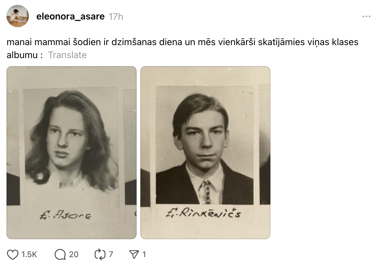 Eleonora svinējusi savas mammas jubileju, un pacilātā noskaņojumā pētījusi ģimenes fotoalbumus. Te pēkšņi blakus mātes skolas gadu noģīmim viņa ieraudzījusi arī Latvijas prezidenta Edgara Rinkēviča portretu. Rinkēvičs bijis ieraksta autores māmiņas klasesbiedrs. «Threads» lietotāju vidū šis kadrs guvis vairāk nekā divus tūkstošus sirsniņu un pāris desmitus pārpublikāciju.