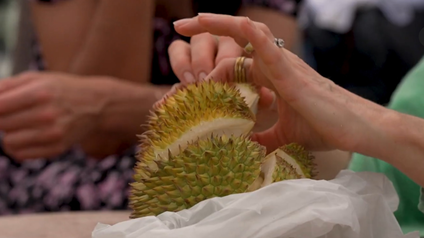 «Šinī brīdī, tas duriāns nemaz vairs nav duriāns, jo mūsu mīlestības enerģija liek smirdēt viņam mazāk,» saka Šeila un pārējie smejas. Četrotne degustē duriānu, un Šeila ir sajūsmā par tā garšu, apgalvojot, ka tā esot mainīga un varot garšot pēc tā, kas katram garšo vislabāk.