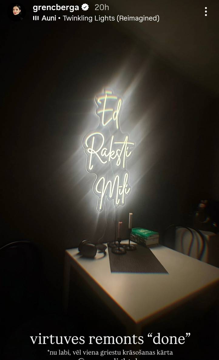 Tāpat Inga dalījusies ar ainiņām no savas jaunās dzīves, kas, visticamāk, nozīmē arī jaunu mājvietu. Inga nodevusies virtuves remontam un virs viņas ēdamgalda rotājas mākslinieciski izgaismoti vārdi – «Ēd. Raksti Mīli».