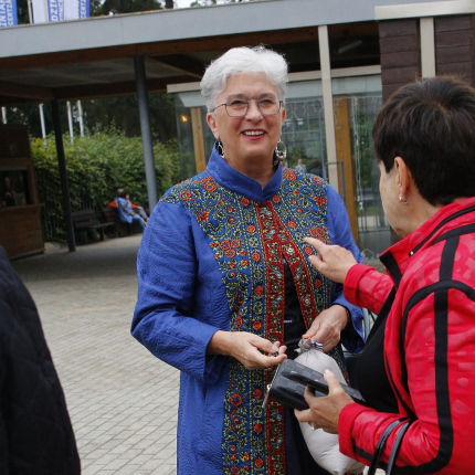 Uz tā redzami indonēziešiem raksturīgi ornamentālie liekumi, kuros ietverti pāvi un citi vietējie putni un ziedi. Pats mēteļa stils gan vairāk raksturīgs Ziemeļķīnai un Mongolijai,» norāda deputāte. «Mēteli stepēju ar roku, un tur iekšā ir plāna vatelīna kārta, kas krāsainiem pavedieniem un sīkiem dūrieniem piestrādāta pie kokvilnas virskārtas.» Sandrai krāšņo audumu iedevis vīrs Ansis Reingarts, kurš ir liels ceļotājs. «Būdams arhitekts, viņš novērtē skaistas, lokālas lietas, kuras redzot nespēj turēties pretī kārdinājumam tās iegādāties. Viņa krājumos ir dažādi eksotiski audumi,» stāsta Sandra.