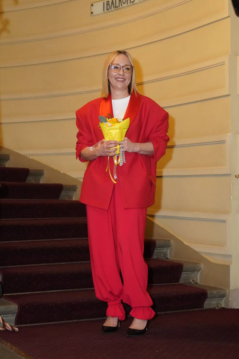 «Var redzēt, ka kostīms veidots tieši valkātājai. Savdabīga žakete un sievišķīgas bikses, kuru audums labi krīt ap potīti. Pateicoties tērpa krāsai un formai, šeit vispār nav vajadzības pēc kādiem papildu aksesuāriem. Labs veids, kā ātri sagatavoties svinīgam pasākumam.»