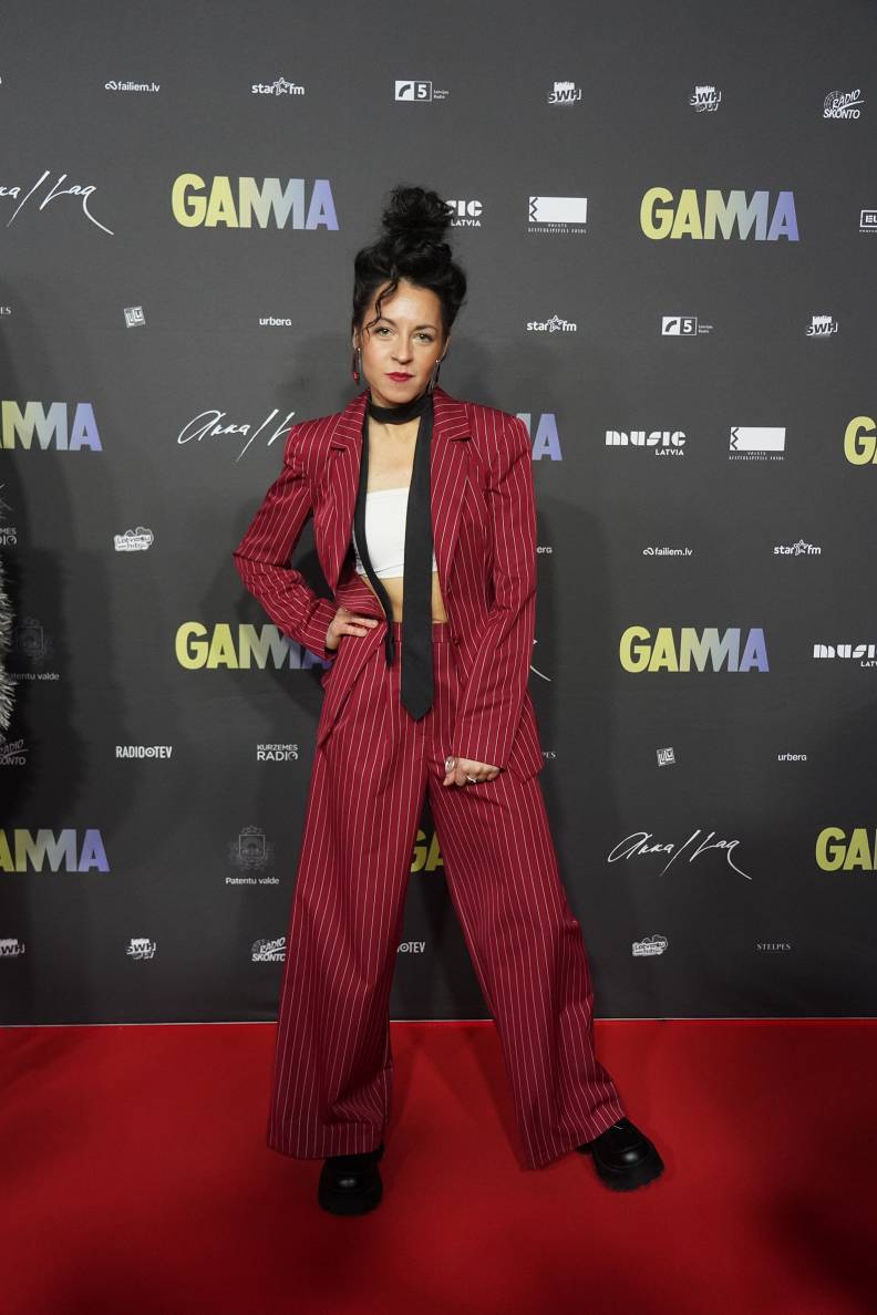 «Vīrišķīgas, apjomīgas žaketes un platas bikses prasa smalku ķermeņa uzbūvi. Šis kontrasts rada patīkamu sievišķīgo pievilcību. Valkātāja izvēlējusies audumu Latvijas karoga krāsās, kas atdzīvina un akcentē pašu valkātāju. Matu sakārtojums un melnā kaklasaite saskan ar apaviem. Grims draudzējas ar kostīma pamatkrāsu, izvēlētie auskari ļoti labi der klāt. Topiņš varētu būt arī citā krāsā, bet kopumā komplekts šķiet pārdomāts».