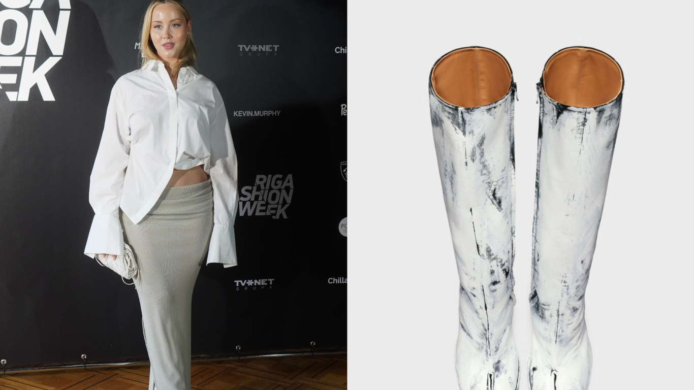«Modes nedēļas atklāšanas dienā gribēju uzvilkt mugurā ko tumšāku, taču ieskatījos savā skapī un sapratu, kā tieši es šobrīd jūtos. Viss taču iet roku rokā – apģērbs un mana mentālā izjūta,» skaidro viņa. Laura izvēlējusies kombinēt baltu, pelēku un krēmkrāsu. Latviešu zīmola Pixie Won’t Play kreklblūzei un Rick Owens vs Maison Margiela zābakiem Vizla pieskaņoja Bottega Veneta somiņu. Efektīgie sudrabspožie zābaki nopērkami par 1890 eiro. Savukārt baltā somiņa maksā vismaz 1500 eiro.
