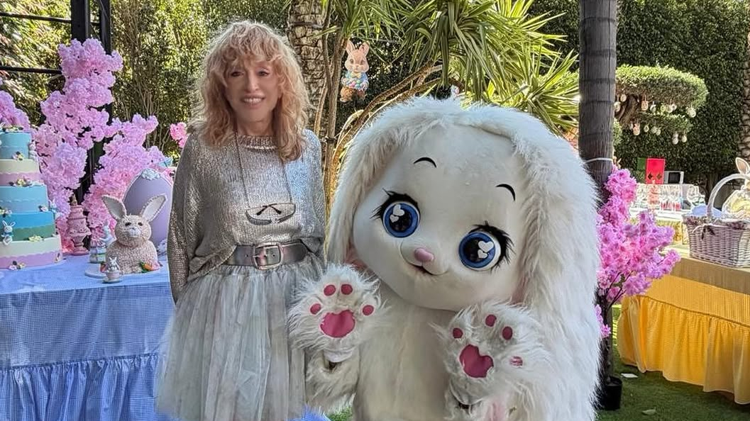 Svētki šoreiz aizvadīti brīvā dabā, dārzā, kur uzklāti galdi un valdījusi īsta pavasara noskaņa. Uzmanības centrā – pati Pugačova, kas pozē kuplos minisvārciņos blakus iespaidīgam zaķim.