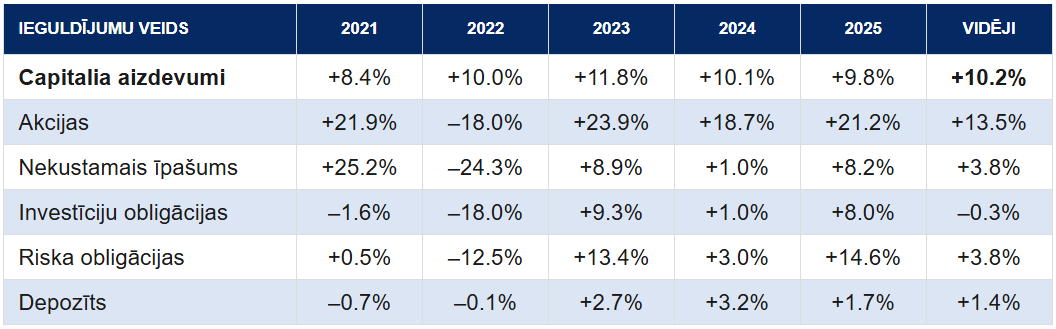 Investors, kurš vēlas maksimālu atdevi un ir gatavs dzīvot ar svārstībām, šo mērķi visdrīzāk sasniegs akcijās. Investors, kuram svarīgākais ir kapitāla drošība ar minimālu peļņu, izvēlēsies depozītu. Savukārt investors, kurš mērķē uz stabilu 9–13% atdeves līmeni neatkarīgi no tirgus svārstībām, pēdējos deviņos gados šādu profilu būtu atradis tieši Capitalia platformā.