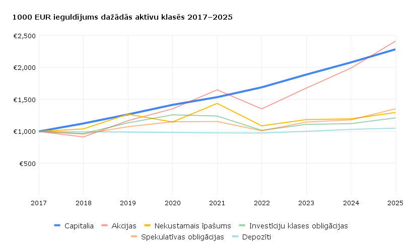 Lai ilustrētu dažādu ieguldījumu rezultātu, aplūkosim vienkāršu piemēru: 2017. gada sākumā investors iegulda 1000 EUR katrā izvēlētajā aktīvu klasē un ieguldījumu neaizskar līdz 2025. gada beigām. Tas parāda ne tikai galarezultātu, bet arī ieguldījuma vērtību izmaiņu, ko investors piedzīvo katrā kategorijā.