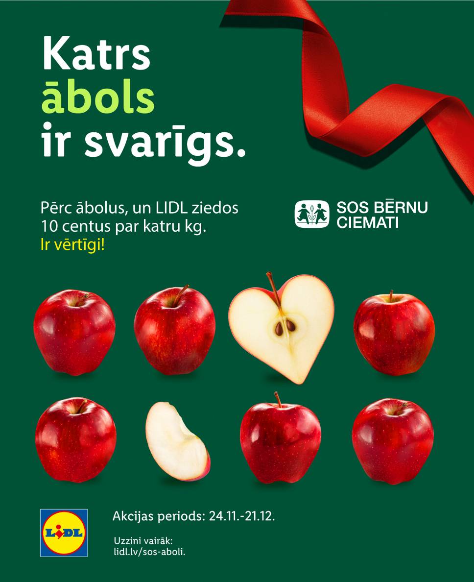 Par katru pārdoto ābolu kilogramu līdz 21. decembrim “Lidl” ziedos 0,10 eiro SOS Bērnu ciematu asociācijai. Savāktie līdzekļi tiks novirzīti svētku mielastiem visos SOS bērnu ciematos un jauniešu mājās Latvijā, kā arī nodrošinās izglītojošu atbalstu veselīga uztura zināšanu un prasmju attīstīšanai.