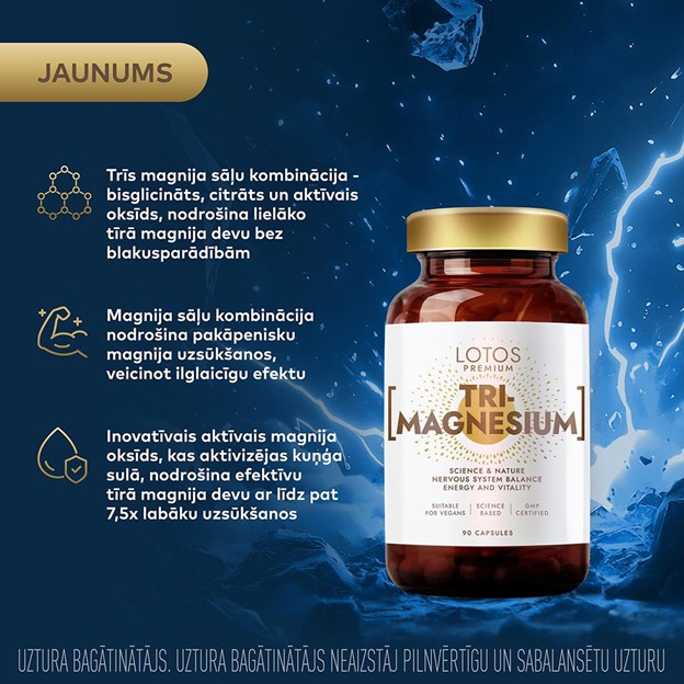 LOTOS PREMIUM Tri-Magnesium no Lotos Pharma apvieno šīs trīs formas – bisglicinātu, citrātu un īpašu aktīvo oksīdu, kas aktivizējas kuņģī, nodrošinot labāku uzsūkšanos nekā tradicionālais oksīds.
