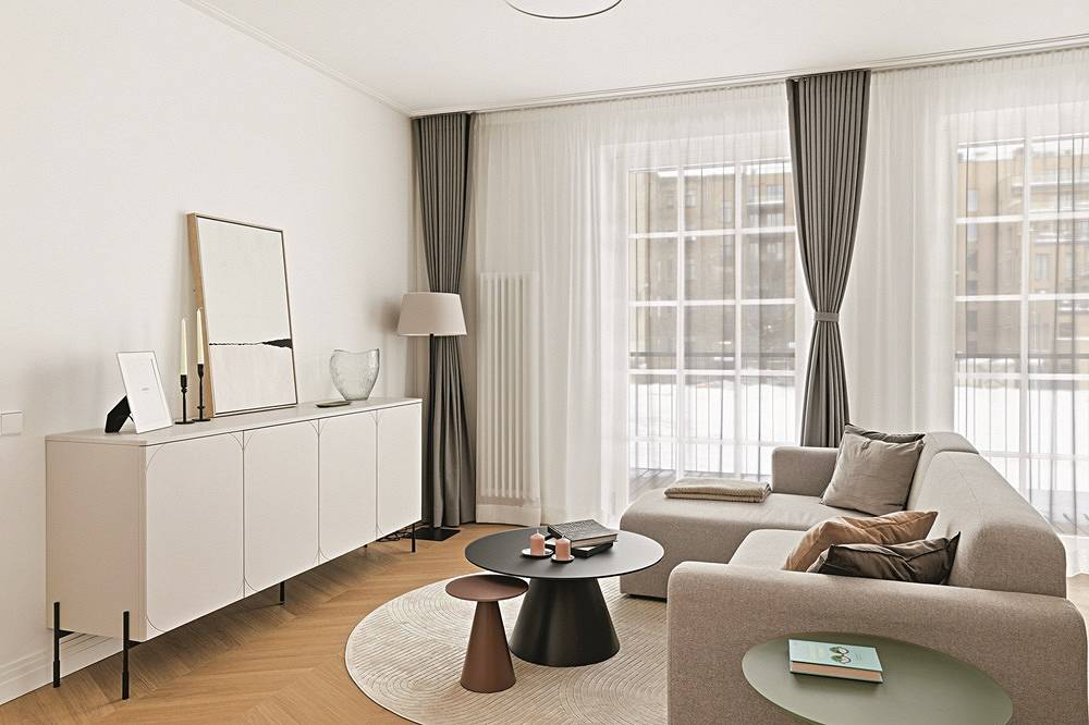 Ilgtermiņa īrei pieejami gan pilnībā, gan daļēji mēbelēti dzīvokļi, sākot no kompaktiem studio līdz plašiem divu guļamistabu plānojumiem. Tiem radīts mūsdienīgs, eleganti ieturēts interjers ar dabiskiem un ilgmūžīgiem apdares materiāliem un mēbelēm. Piemēram, virtuvēs ērti darboties ļauj izturīgās akmens virsmas un augstas klases tehnika. Lielākajā daļā dzīvokļu ir divi ar kvalitatīvu santehniku aprīkoti sanitārie mezgli, kā arī noliktavas telpa ar modulāru plauktu sistēmu.