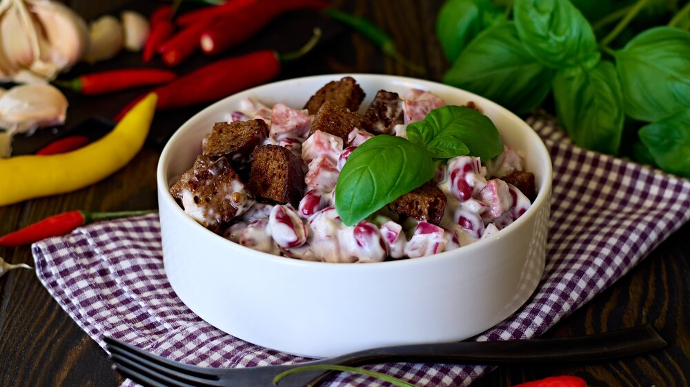 • Salāti ar kūpinātu desu, grauzdiņiem un pupiņām