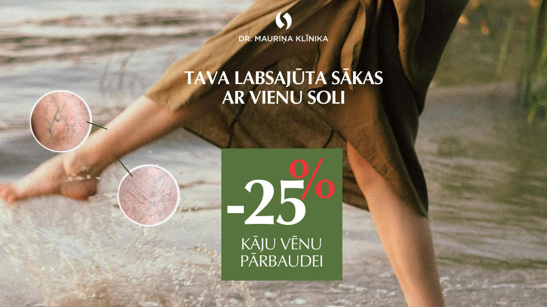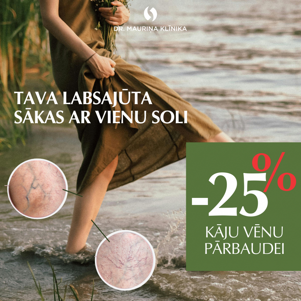 Lūdzam ņemt vērā, ka veselības apdrošināšanas polises var segt kāju vēnu pārbaudes un ārstēšanas izdevumus. Dr. Mauriņa klīnikā Rīgā jūnijā tiek piedāvāta 25 % atlaide kāju vēnu dupleksultrasonogrāfijas izmeklējumam un ārsta konsultācijai. Atlaide netiek piemērota konsultācijām pie klīnikas vadītāja Prof. Ulda Mauriņa un fleboloģijas nodaļas vadītāja Dr. med. Andreja Vanaga.