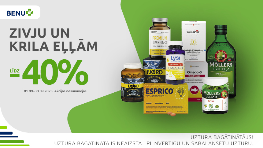 Visu septmebri klātienes BENU Aptiekās īpaši izdevīgas cenas dažādiem produktiem imunitātes stripināšanai un zivju un krila eļļām – ar atlaidēm līdz pat 40 %!