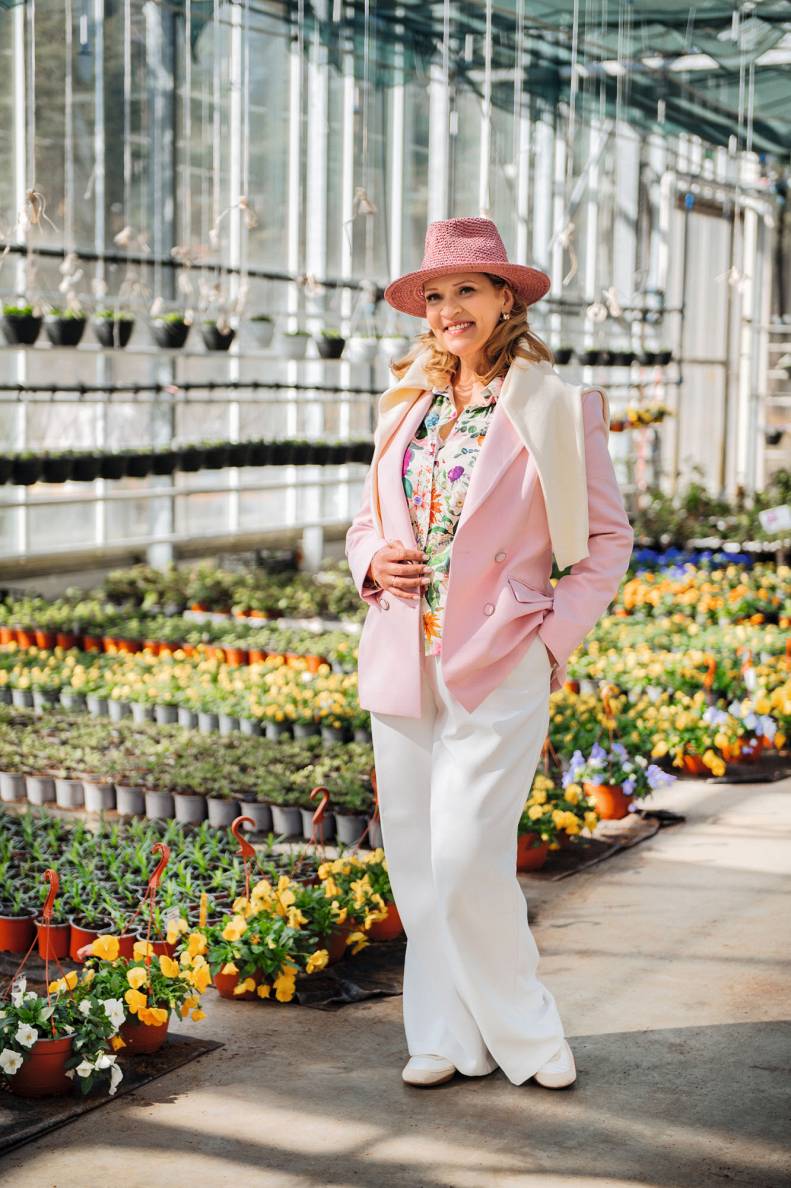 Žakete – 65,95 € Zara, platmale (roku darbs), dizainere Ingrida Vigovska – 150 € @By_INVIGO, blūze – 29,95 € Zara, bikses – 39,95 € Zara, jaciņa pāri pleciem – 29,95 € Zara, auskari – 49,95 € Massimo Dutti, apavi – 39,95 € Zara.