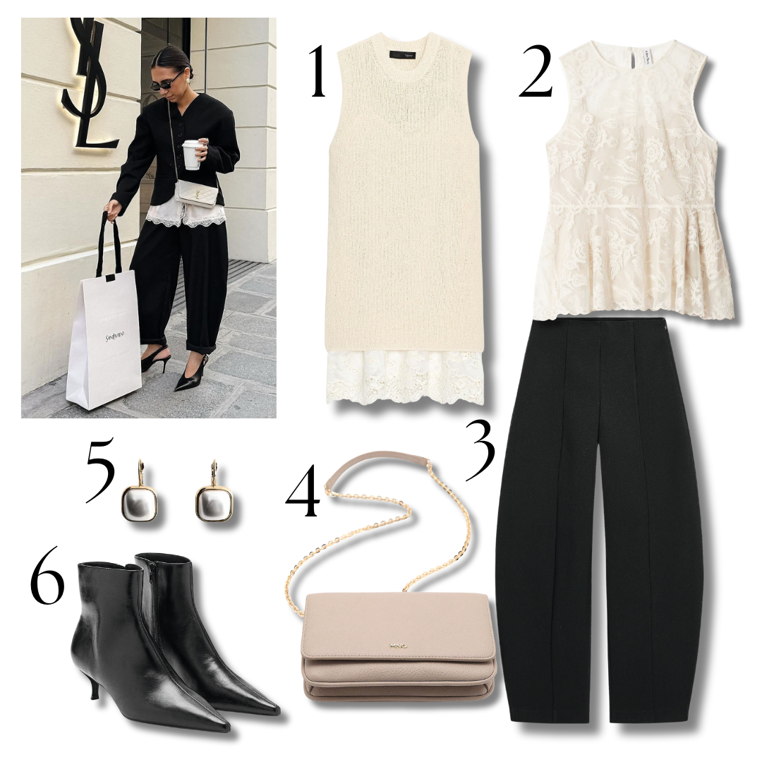 1. Adīta kleita ar mežģīņu malu – 49,95 € zara.com 2. Tops ar mežģīni – 39 € stories.com 3. Melnas bikses – 45,95 € zara.com 4. Gaiša plecu somiņa – 25,99 € shop.mango.com 5. Auskari – 15,99 € shop.mango.com 6. Puszābaki ar smalku papēdi – 49,99 € shop.mango.com