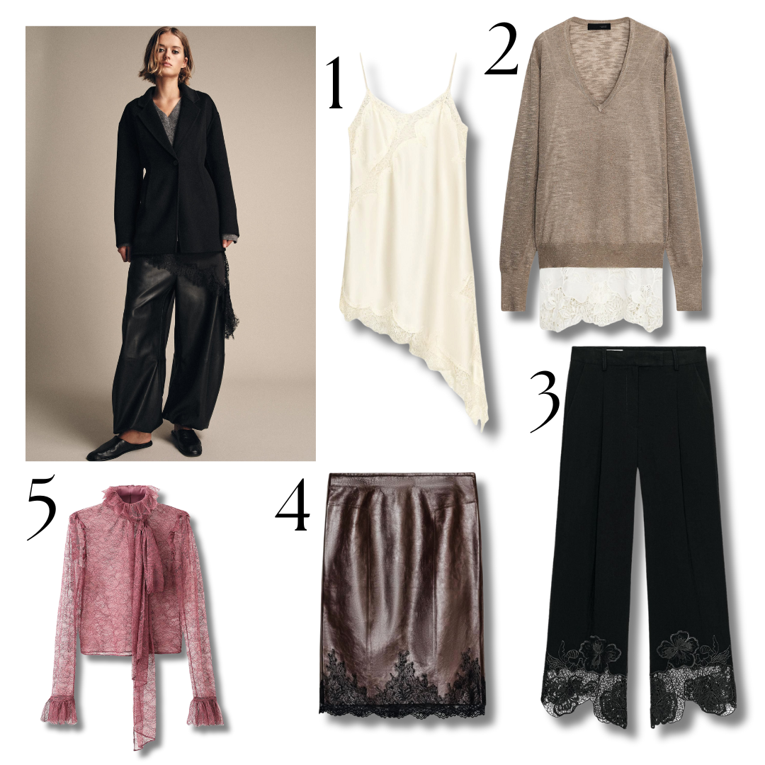 1. Balta asimetriska mežģīņu kleita – 59,95 € zara.com 2. Adīta kleita ar mežģīņu malu – 49,95 € zara.com 3. Bikses ar mežģīni – 45,95 € zara.com 4. Ādas svārki ar mežģīni – 149 € zara.com 5. Rozā blūze ar lenti – 59,99 € shop.mango.com