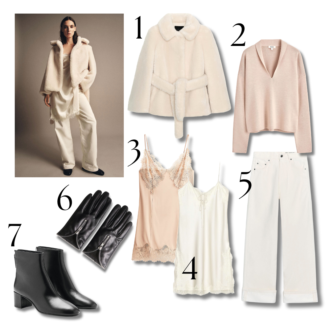 1. Kažoks – 109 € zara.com 2. Bēšs džemperis, merīnvilna – 99 € cos.com 3. Bēša īsa kleita – 49,99 € hm.com 4. Gaiša kleita ar mežģīni – 59,95 € zara.com 5. Balti džinsi – 49,95 € zara.com 6. Ādas cimdi – 39,99 € hm.com 7. Puszābaki ar stabilu papēdi – 69,99 € shop.mango.com
