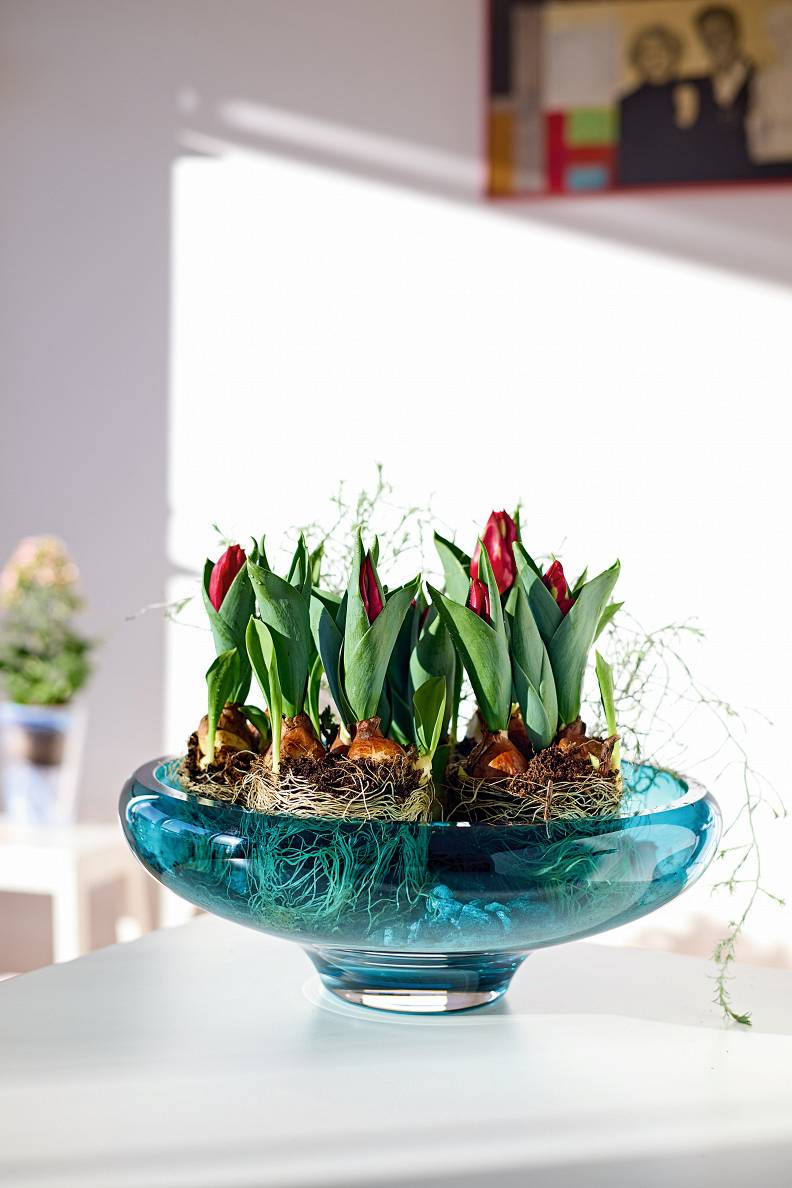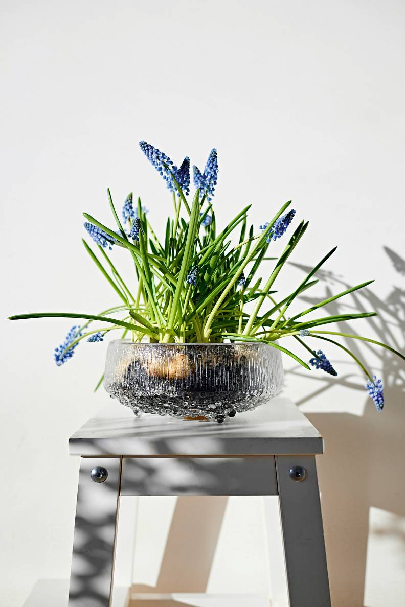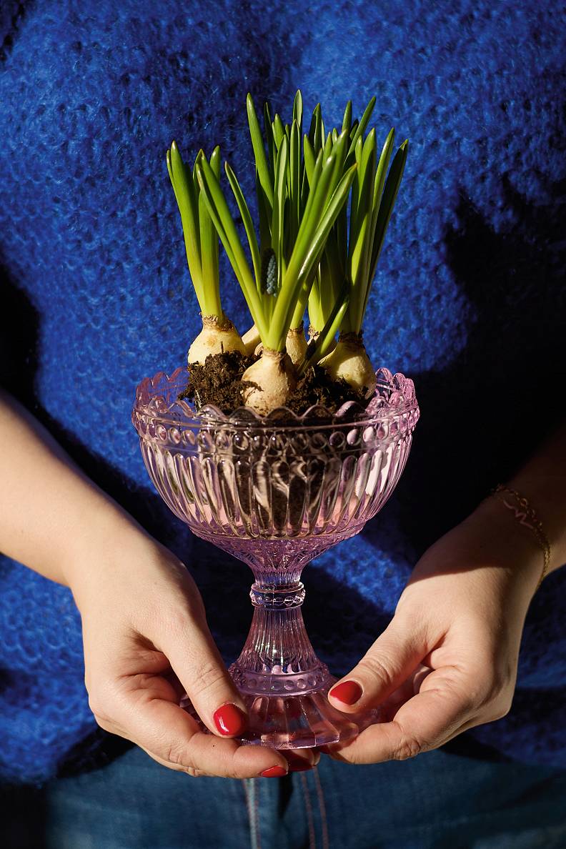Man vienmēr ir paticis pavasara ziedus izņemt no podiņa, kas nācis komplektā, un stādīt skaistos traukos, tā padarot interesantāku gan pašas dzīvi, gan arī kādas bļodas ikdienu. Visvairāk izmantoju stikla vāzes, glāzes, bļodas, jo tā var parādīt ne tikai zieda skaistumu, bet arī pazemes ornamentus. Un galvenais – tas ir ātri un neprasa pat zaļos pirkstiņus. Sīpolpuķes vēlāk ierušinu dārzā.
