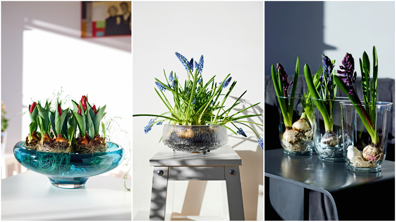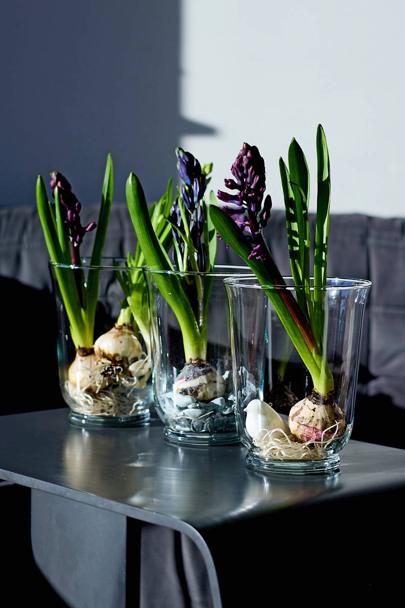 Hiacinšu sīpoli ir tik dekoratīvi, ka grēks tos neeksponēt. Saknēm jāielej nedaudz ūdens. Izmantoju IKEA nopērkamos traukus – tajos gan lieku sveces, gan kaut ko iestādu, gan izmantoju grieztajiem ziediem.
